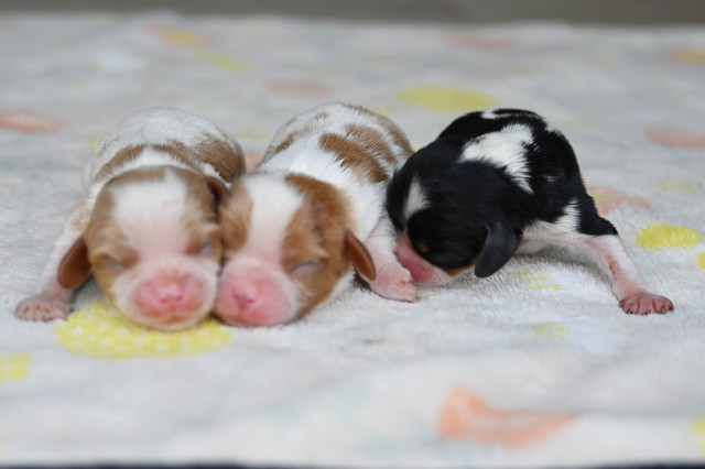 お問い合わせ番号: S_340 仔犬掲載日:2025/08/02 最終更新日:2025/09/07 キャバリアキングチャールズスパニエル 男の子 2匹 女の子 1匹 親犬コメント 初産のお母さんです。出産、子育てと私たちと一緒に頑張っています。 仔犬コメント 7月26日にキャバリアが産まれました。健康状態はまだ保障が出来ないため正式にお譲りする事ができません。9月上旬頃に仔犬販売へ掲載予定です。仔犬販売掲載前に飼い主様が決まる事も御座いますので現在の状況についてはお気軽にメール、お電話でお問い合わせ下さい。お客様へのお渡しは生後60日前後となります。予約制となっておりますのでご見学に関しては必ず事前にご連絡下さい。※仔犬販売掲載前に男の子×1、女の子×1ご家族が決まりました 関連URL https://ameblo.jp/koinu-aporo/entry-12920308149.html https://ameblo.jp/koinu-aporo/entry-12923556068.html https://ameblo.jp/koinu-aporo/entry-12928374338.html ▲ 画像クリックで拡大します。 9月6日撮影 9月6日撮影 8月15日撮影 8月15日撮影 キャバリアブリーダー キャバリアブリーダー