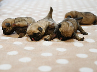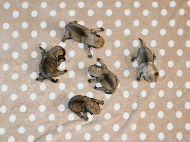 お問い合わせ番号: S_352 仔犬掲載日:2025/10/10 最終更新日:2025/10/10 パグ 男の子 0匹 女の子 5匹 親犬コメント 愛情深く甘えん坊な性格のお母さんですが、いざ子育てとなると頼もしいです。 仔犬コメント 10月6日にパグが産まれました。健康状態はまだ保障が出来ないため正式にお譲りする事ができません。11月中旬頃に仔犬販売へ掲載予定です。仔犬中売掲載前に飼い主様が決まる事も御座いますので現在の状況についてはお気軽にメール、お電話でお問い合わせ下さい。お客様へのお渡しは生後60日前後となります。予約制となっておりますのでご見学に関しては必ず事前にご連絡下さい。 ▲ 画像クリックで拡大します。