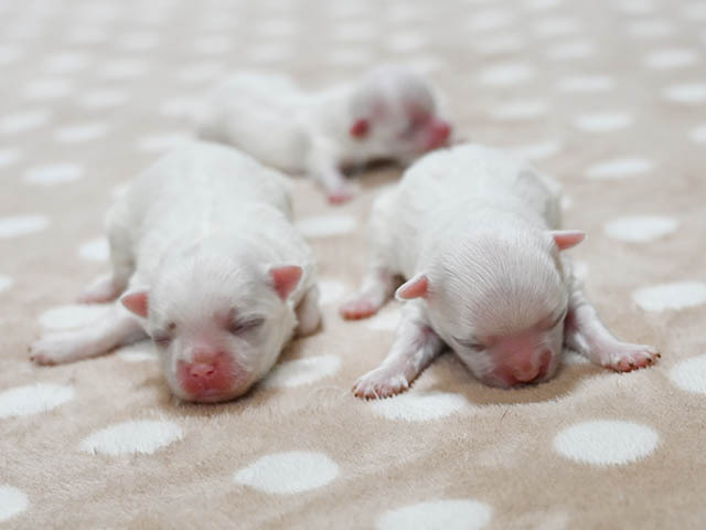 お問い合わせ番号: S_364 仔犬掲載日:2025/12/31 最終更新日:2025/12/31 マルチーズ 男の子 1匹 女の子 2匹 親犬コメント 可愛いお母さんが出産、子育てと頑張っています。 仔犬コメント 12月26日にマルチーズが産まれました。健康状態はまだ保障が出来ないため正式にお譲りする事ができません。2月上旬頃に仔犬販売へ掲載予定です。仔犬中売掲載前に飼い主様が決まる事も御座いますので現在の状況についてはお気軽にメール、お電話でお問い合わせ下さい。お客様へのお渡しは生後60日前後となります。予約制となっておりますのでご見学に関しては必ず事前にご連絡下さい。 ▲ 画像クリックで拡大します。