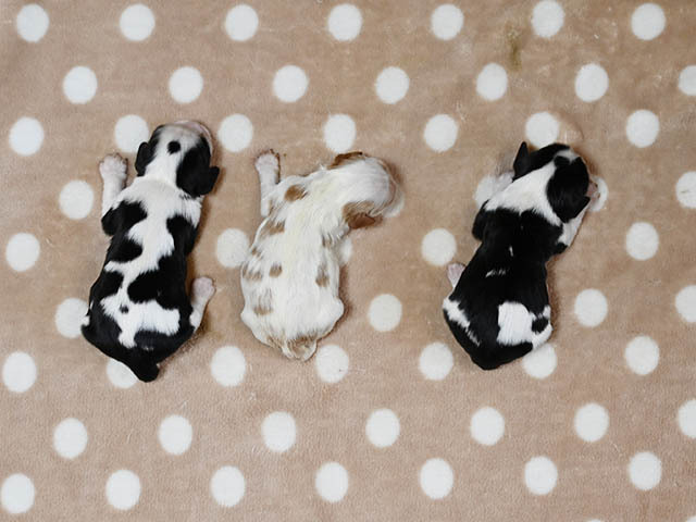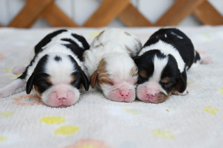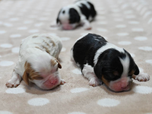 お問い合わせ番号: S_373 仔犬掲載日:2026/02/24 最終更新日:2026/02/24 キャバリアキングチャールズスパニエル 男の子 1匹 女の子 2匹 親犬コメント 綺麗なお顔のお母さんです。性格は明るく手甘えん坊です。 仔犬コメント 2月20日にキャバリアが産まれました。健康状態はまだ保障が出来ないため正式にお譲りする事ができません。3月下旬頃に仔犬販売へ掲載予定です。仔犬販売掲載前に飼い主様が決まる事も御座いますので現在の状況についてはお気軽にメール、お電話でお問い合わせ下さい。お客様へのお渡しは生後60日前後となります。予約制となっておりますのでご見学に関しては必ず事前にご連絡下さい。 関連URL https://ameblo.jp/koinu-aporo/entry-12957749816.html ▲ 画像クリックで拡大します。 キャバリアブリーダー キャバリアブリーダー