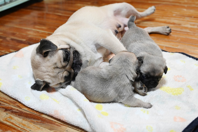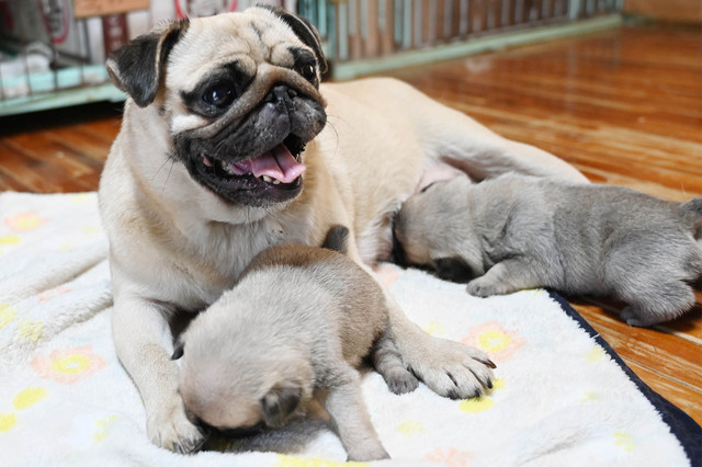 お問い合わせ番号: S_372 仔犬掲載日:2026/02/21 最終更新日:2026/04/02 パグ 男の子 1匹 女の子 3匹 親犬コメント とても愛情深く赤ちゃんを大事に寄せて行く姿に感動します 仔犬コメント 2月17日にパグが産まれました。健康状態はまだ保障が出来ないため正式にお譲りする事ができません。3月下旬頃に仔犬販売へ掲載予定です。仔犬販売掲載前に飼い主様が決まる事も御座いますので現在の状況についてはお気軽にメール、お電話でお問い合わせ下さい。お客様へのお渡しは生後60日前後となります。予約制となっておりますのでご見学に関しては必ず事前にご連絡下さい。 関連URL https://ameblo.jp/koinu-aporo/entry-12957417583.html https://ameblo.jp/koinu-aporo/entry-12959075642.html ▲ 画像クリックで拡大します。 3月8日撮影 3月8日撮影 パグブリーダー パグブリーダー